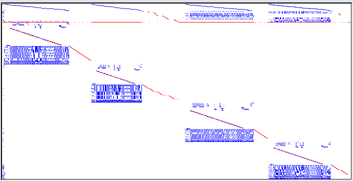 Here is the same problem with rows and columns permuted with just a click into block-triangular format. If a matrix has good block-triangular structure, then the model is likely to perform well when solved with the new Branch-and-Price solver.