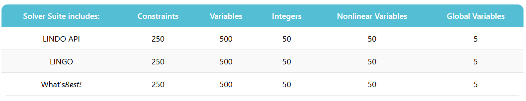 Solver Suite includes introductory versions of LINDO, LINGO, LINDO API and What'sBest!.